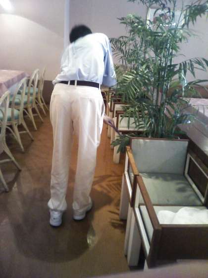 写真は,ベッドメイク,浴場の脱衣所の清掃,レストランの清掃の様子です。
