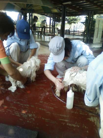 グリーンランドには動物と触れ合える広場もあります。ヤギ小屋の掃除だけでなく,今度は犬のシャンプーにも挑戦しました。