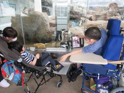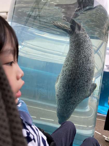 一段と目を引く大きなチューブ状の水槽。「なんだろう…」と思いながら覗いてみるとゴマアザラシが。実は床の下で別の水槽とつながっていて,ゴマアザラシが自由自在に行ったり来たりしているようで,その様子を観察しました。そしてたくさんの海の生き物が悠々と泳ぐ大水槽は圧巻でした。どんないきものがいるのかをじっくりと探してみました。たくさんの生き物を見ることができ,大興奮の2人でした。