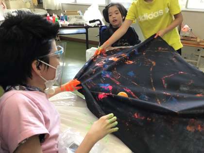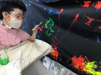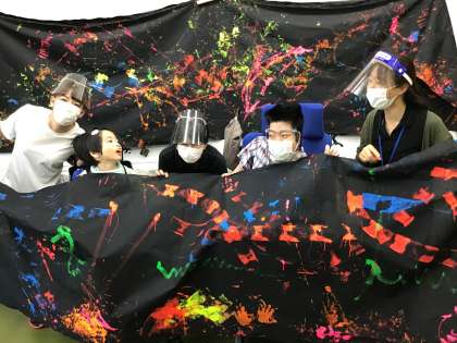 先日,普通科で本校学習を実施しました。いつもより広い教室で朝の会をしたり,造形活動をしたりしました。造形活動ではダイナミックアートに挑戦。教室の壁いっぱいの布に,蛍光絵の具で思いっきり描きました。筆やローラーを使ったり,絵の具のついたボールを転がしたり,いろいろな方法で描き,素敵な作品に仕上がりました。