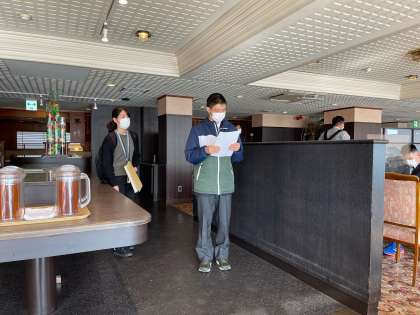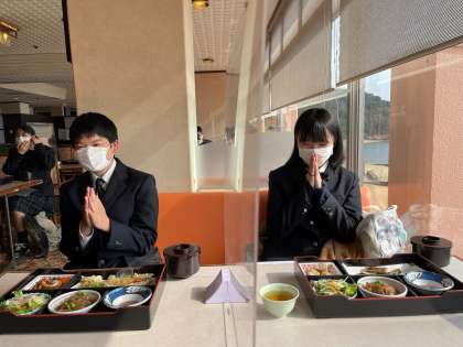 下電ホテルに到着しました。いただきますの挨拶をして、待ちに待った昼食を食べます!