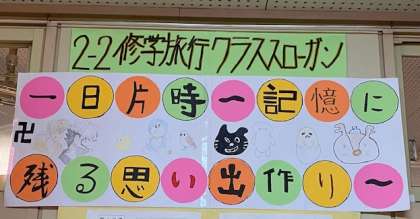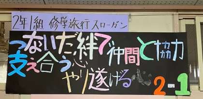 今回の修学旅行の学年目標は「一笑懸命〜一人ひとりが支え合い 笑顔あふれる修学旅行に〜」でした。23名がそれぞれ意見を出し合い,話し合いを重ねて決めた目標でしたね。