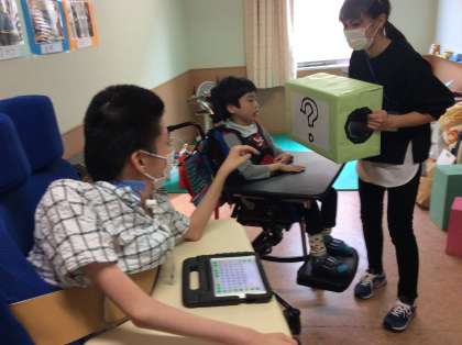 「この中には何が入っているでしょう?」と,登場したハテナボックス。傾けてみると,ゴロゴロゴロ・・・と音がします。おそるおそる中に手を入れてみると,「冷たい」「かたい」「頭に葉っぱがついている」など,中のものに触れてみた感想がたくさん出てきました。なんだろう,と指導者と一緒に考えていると,「大根かな?」と答える生徒がいました。今日はクイズ形式で,いろいろな野菜の形や触った感触を楽しむ活動をしました。中にはなじみのない野菜もありましたが,実際に触れてみることで覚えることができました。次回は野菜を切って,断面模様を見てみましょう。