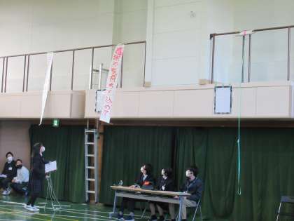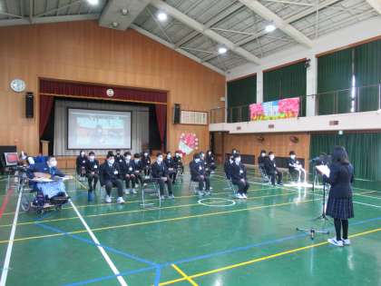 体育館に入場した3年生と,各教室にいる普通科や生活産業科1,2年生とオンラインでつなぎ,3年生に向けて学部・学年ごとに心のこもったメッセージを送り,各学年の発表を披露しました。そして今までの感謝の気持ちを伝え,28名の卒業をお祝いし,思い出に残る時間をみんなで過ごしました。
