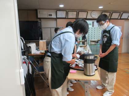 専門教科の福祉・介護の生徒が,参加者の皆様にお飲み物とお菓子をお出ししました。「おもてなし」の実践の場として,貴重な体験となりました。