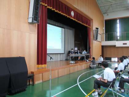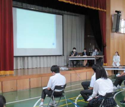 講師紹介にはじまり、係長様からは、仕事に必要な力や在学中から習慣にしたい力について、卒業生からは、後輩に向けて 学校生活で大切にしてほしいことなどを実際に経験したことも含めて、大変わかりやすくお話していただきました。また、質問にもお答えしていただき、聞いていた生徒たちは、心を込めて話してくれる「働く先輩」の話に熱心に耳を傾けていました。