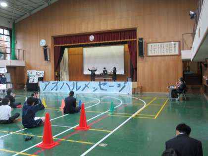 6限に,児童生徒会主催の「アオハルメッセージ」が体育館で行われました。体育館にいる仲間から、「なーに」「いぇーい」「なんだって?」のかけ声の中、みんなに聞いてほしい自分の思いや特技を披露しました。歌,楽器演奏,友人へのエール,そして決意表明があり,そのあと、ダンス部と音楽部によるエンディングがあり、楽しい時間を過ごしました。