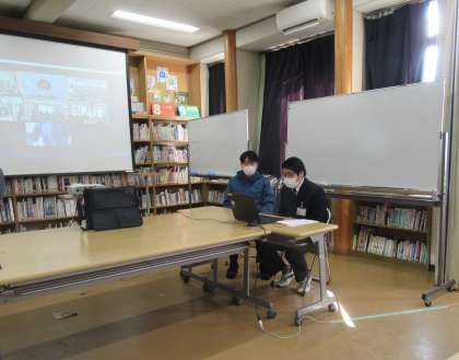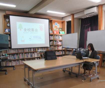 授業終了日の5限に児童生徒会本部役員の進行で、冬季休業前の全校集会をオンラインで行いました。学校長から学校生活の振り返り、鳴滝の生徒の優しさあふれる嬉しい出来事、学校評価からの課題の共有、健康に過ごすことの大切さの話がありました。また、専門委員会からの連絡、作品の表彰、生徒指導主事からの冬休みの過ごし方についての話がありました。