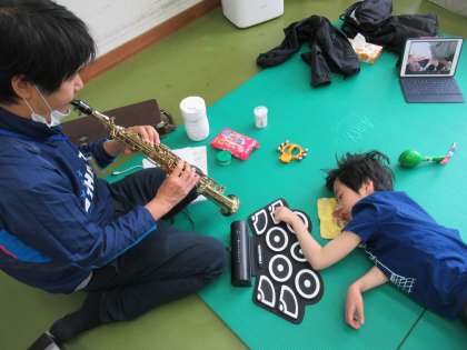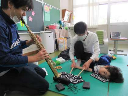 中学部ではエイトビートでセッションが行われました。ソプラノサックスと電子ドラムパッドを演奏し、大好きな「ミッキーマウスマーチ」も演奏しました。