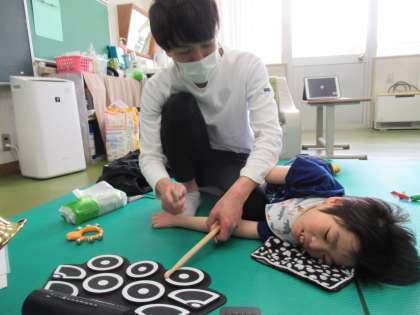 保護者の方と一緒にドラムを叩くたびに、不思議そうな、また、嬉しそうな笑顔が溢れました。