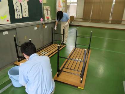 「福祉」の生徒は、グラウンドで使用した砂で汚れた机をきれいに、