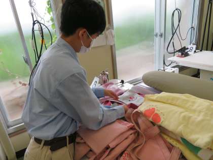 京都市の『こどもみらい館』『右京中央図書館』、学校近くの『宇多野ユースホステル』へ出向いて、洗濯物を預かってきます。エプロンやバスタオル、毛布、枕カバーなどを洗濯して、お届けします。定期的に利用していただく、大切なお得意様です。