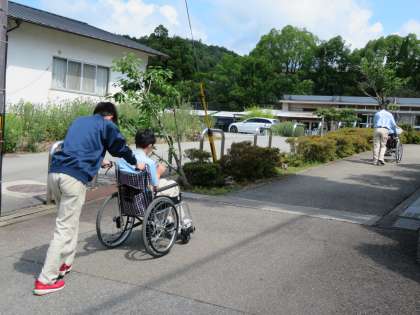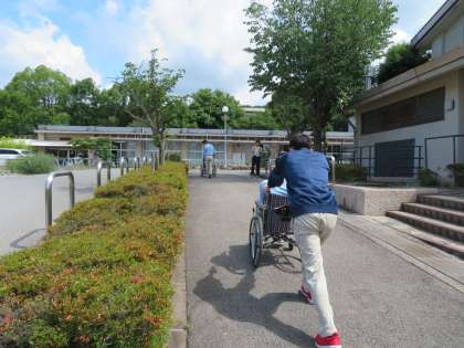 校内を車いすで移動し、段差や狭い所の通り抜け、エレベーターの乗降の介助方法などを学習した後、実際に校外に出かけて練習します。