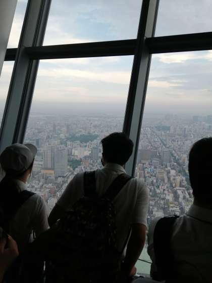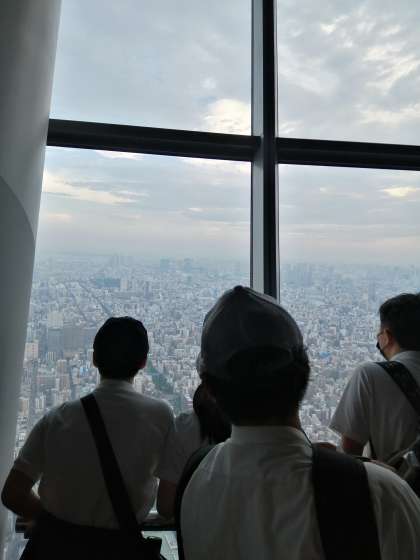 展望台に上がり、東京の街を眺めています。スカイツリーを楽しみにしている人もたくさんいました。