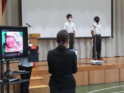 始業式後、特別全国障害者スポーツ大会「燃ゆる感動かごしま大会」と全国障害者技能競技大会「全国アビリンピック大会」に出場する選手2名の壮行会が行われました。