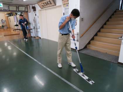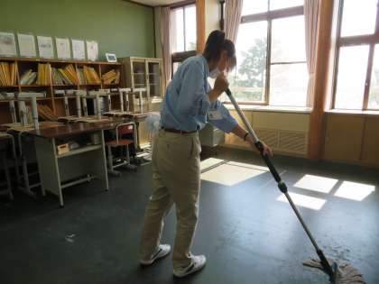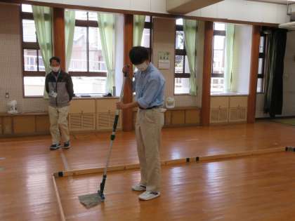 「メンテナンス」では、ダストクロスモップや糸ラーグ等の新しい清掃道具の使い方を練習しています。廊下や木枠の中で練習をしてから、実際に教室を清掃していきます。