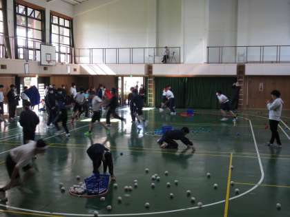 1点のゾーンと2点のカゴがあります。どちらを狙って高得点を取るか、それぞれ意見を出し合い、競技に挑みました。結果はどうだったかな。ワクワクした気持ちで得点発表を聞いていました。