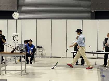 午前中はカーペット床清掃、午後は弾性床清掃と机上清掃の2つの課題にチャレンジしました。会場はとても広く、たくさんの観客が見る中、とても立派な姿を披露することができました。