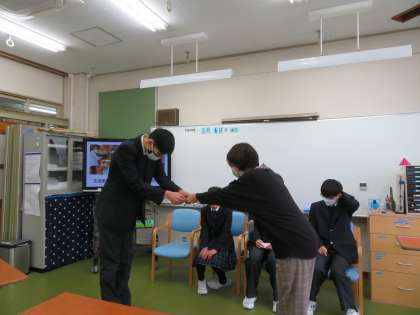 卒業式の予行練習の後に学校長から、その後に携帯用の小さな修了証を授業の担当から、一人ずつが受け取りました。