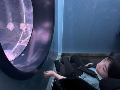 7月4日に、京都水族館へ校外学習に行ってきました。事前学習で館内の様子を見ていたこともあり、終始落ち着いて様々な生き物を鑑賞することができました。特にクラゲの展示は、ゆったり動くクラゲをじっと眺め、気に入った様子でした。昼食のカレーライスも、もりもり食べることができました。