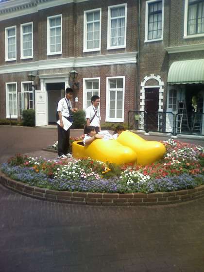 暑い日差しの中,生徒たちは指定のポイントを探して格闘中です。ポイントにはいろいろなものがあります。ここは大きな木靴です。
