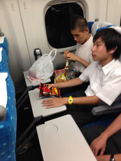 8月29日(金)帰途についています。九州新幹線「つばめ」から新幹線「のぞみ」38号に乗り継ぎました。みんなで乗る修学研修旅行最後の乗り物です。車中では,お菓子の交換会やおしゃべり,または疲れたのかお昼寝等ですごしています。一路京都に向かっています。