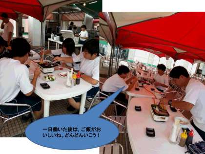 ホテルヴェルデでの職場体験研修を終了し,お風呂に入って夕食はバーベキューです。一日働いた後の食事は,とてもおいしかったことでしょう。