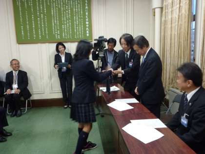 10月30日(金),INAS世界大会の凱旋報告会が市役所で行われました。本校の生活産業科2年千原玉青さんが,その結果報告をしてくれました。