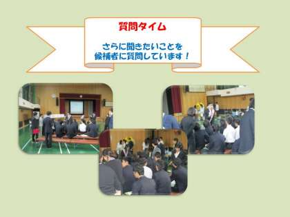 各候補者の選挙公約が書かれた用紙を受け取り,まずは学生サポーターによる選挙の説明を聞きました。その後,3人の候補者それぞれの演説や応援者による応援演説を聞き,さらに聞きたいことや確認したいことを候補者や応援者に質問をして,自分は誰に投票するのかを決めました。そして,実際の選挙と同様に選挙はがきを渡して受付をして,投票用紙を受け取り,記載台で記入をして投票をするという一連の流れを体験しました。