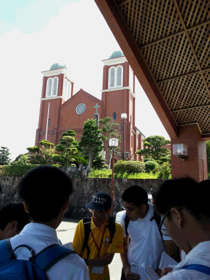 浦上天主堂,如己堂,防空壕と回り,説明を聞いています。