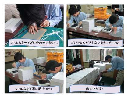 タブレット端末の活用に際しては,生徒会が中心となってルールを作り,全校集会や学活等で確認しました。配布前には,手先の器用な生徒達が手分けして,生徒全員分のタブレット端末に飛散防止フィルムをサイズに合わせて切り取り,貼ってくれました。