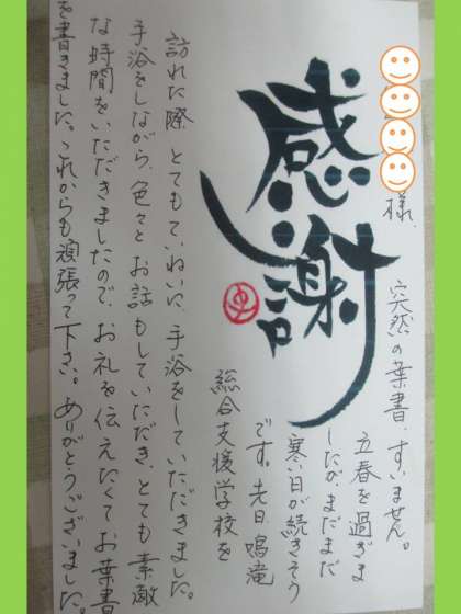 本日,手浴サービスを受けられた参加者の先生から,行なった生徒にお礼のお葉書が届きました。