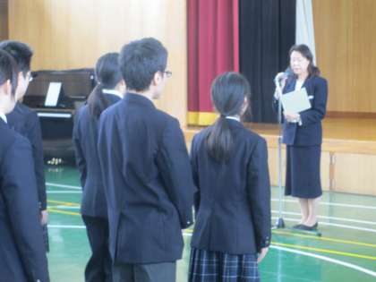 体育館に高等部生活産業科1,2年生が揃い,本校中学部と分教室「わかば」はテレビ会議システムでつないで行いました。