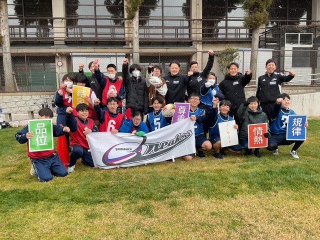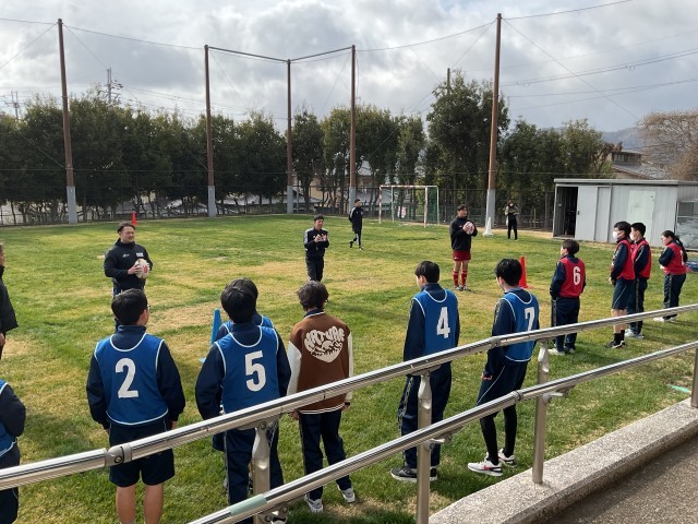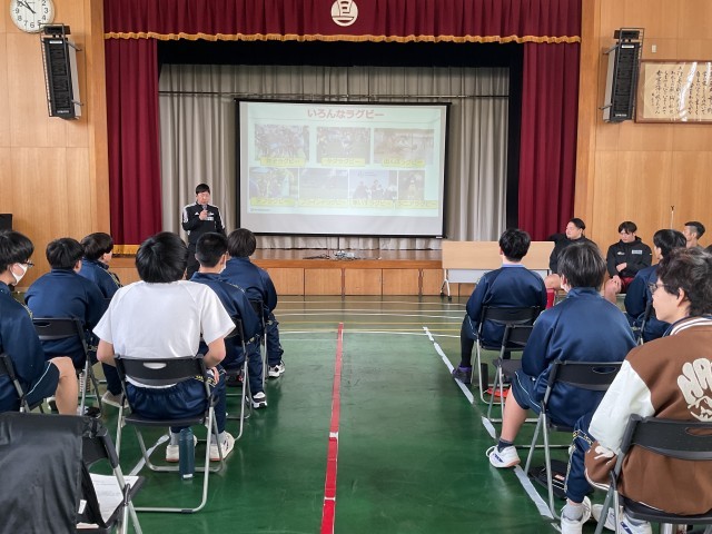 島津製作所から選手2名とスタッフ3名が来てくださり、講義を受け、ラグビーの体験をさせていただきました。働きながらラグビーに取り組んでおられるので、仕事とラグビーを両立する上での工夫や、大事にしていることなどを話していただきました。生徒からの質問にも答えていただき、4月から社会人になる3年生にとって、とても参考になることを教えていただきました。また、ラグビーでは「品位・情熱・結束・規律・尊重」の5つを大事にしているそうで、試合終了を意味する「ノーサイド」の精神も説明していただきました。