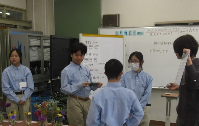 明日の土曜参観に向けて、どこに花を飾ればよいか。花を見てくれる人の気持ちをみんなで考えています。