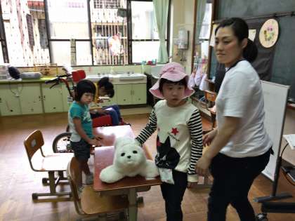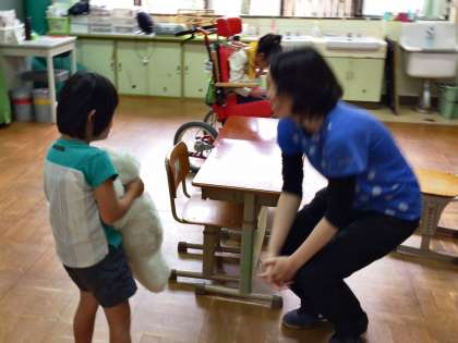 午前中の学習が終わり,給食準備を始める前の少しの休憩時間,小学部3年生の児童が,自分で写真カードを第2職員室に持っていき,「くうちゃん」を教室に借りてきていました。