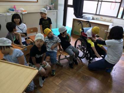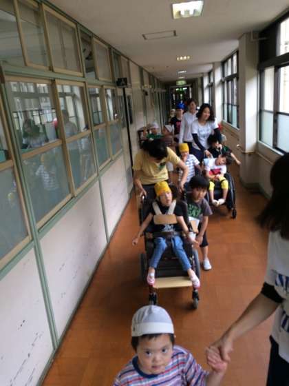 一年生は初めてのプールに向けて水泳帽子をかぶる練習やサンダルで歩く練習をしました。