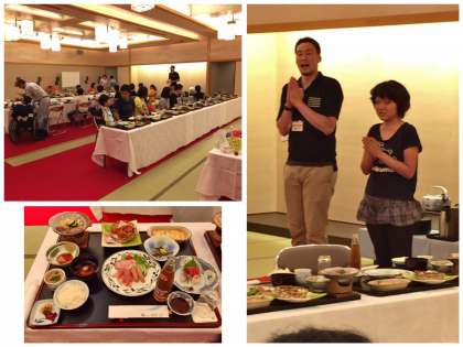 2階 吉祥の間で夕食です。夕食の感想を教えて尋ねると、(一人分が大きなお盆にのっていて) 「たくさんあって、ビックリしました」と教えてくれました。