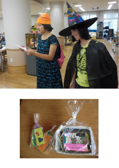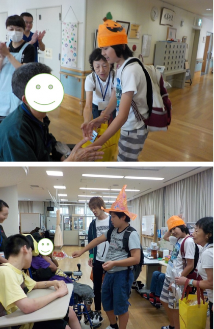 中学部居住地域「久世・桂川」ユニットで桂川療護園に行き、みんなで作ったしおりと小物入れのお皿を渡しました。施設内の3つの場所で,ハロウィンの帽子をかぶって挨拶やプレゼント渡しの役割を果たしました。お世話になっている職員さんに言葉をかけられ、うれしそうな人もいました。バス停で、お年寄りの方に話しかけたり、時計で時刻を確認したりして、市バスを乗り継いで帰ってきました。