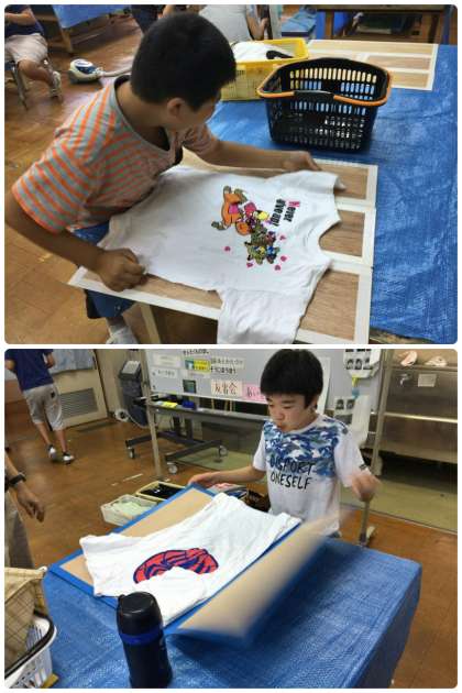 (1)シャツたたみ教具の上にTシャツを広げる