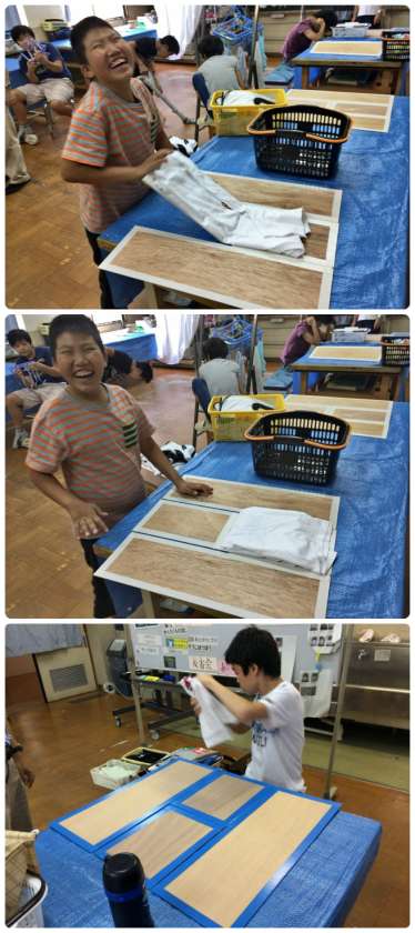 中学部の洗濯・掃除ユニットがTシャツなどをたたんだり,掃除機がけをしていました。
