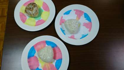 朝食では,事前学習で作ったお皿におにぎりをのせて食べました。