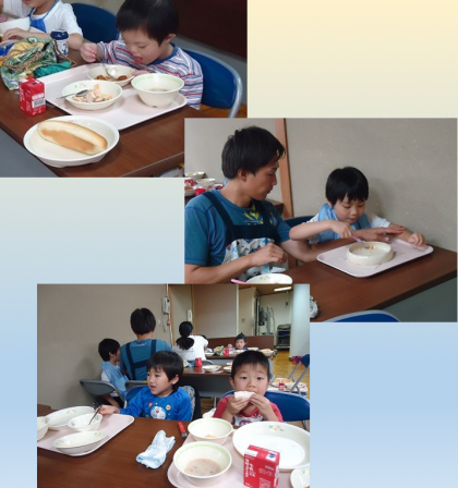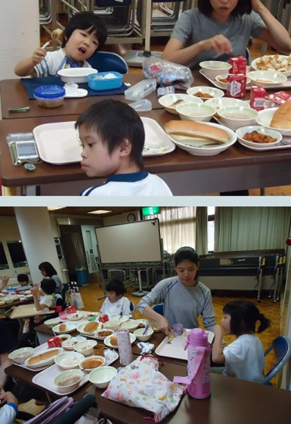 普段はそれぞれの教室で食べていますが,遠足に向けていつもとは違う場所で食べる練習です。