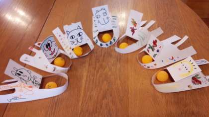 「ピンポン玉ネコ」が完成した後は,ピンポン玉をセットして、坂を滑らせて遊び、とても盛り上がりました。