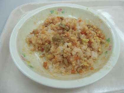 チキンライスの具といり卵をごはんの皿に移して,よくかきまぜて,自分でチキンライスを作って食べます。