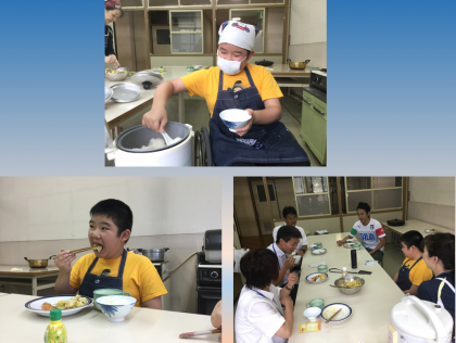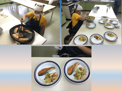 今日、調理実習で,「鮭のムニエル・コブサラダ・コーンクリームスープ」を作りました。今回は8人分をつくりました。