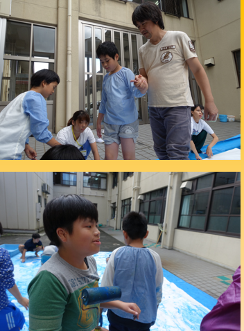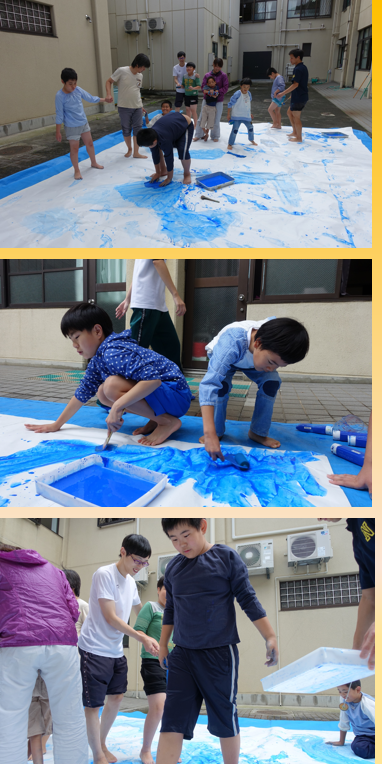 午後からの造形遊びでは教室ほどのの大きな紙に色を塗りました。