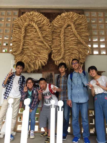 大きな草鞋の前で写真を撮ったり