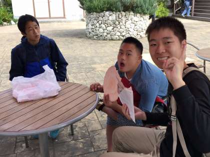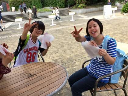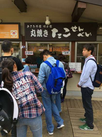 第一グループ、江ノ島の頂上で、たこせんを食べています。