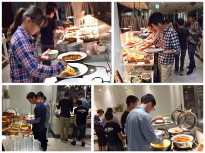 プレミアムブュッフェで夕食です。今日はどのグループもたくさん活動したので、バイキング料理でたくさん食べそうです。